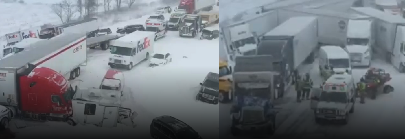 La cadena de choques ocurrió alrededor de las 10:19 a.m. (hora local) cuando la nieve con efecto lago y las superficies resbaladizas provocaron que automóviles y camiones de carga perdieran el control y colisionaran en ambos sentidos de la carretera.